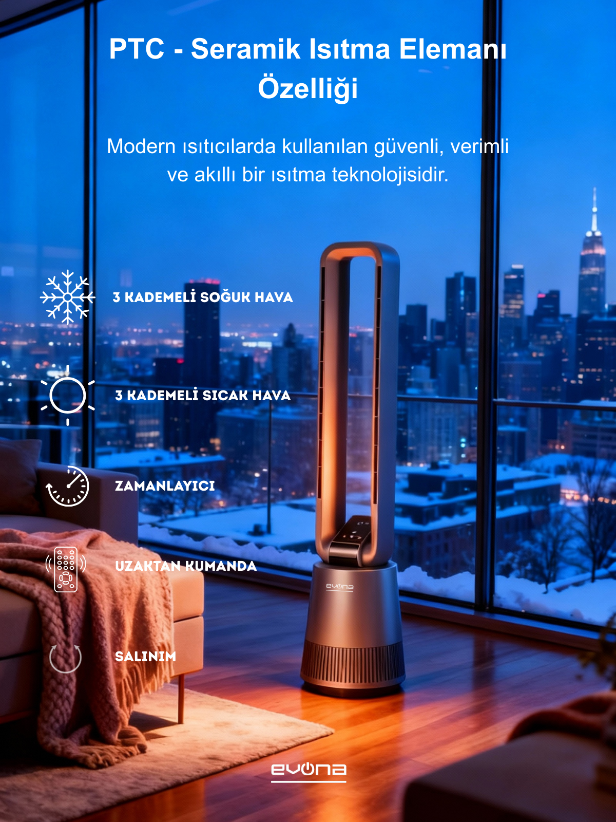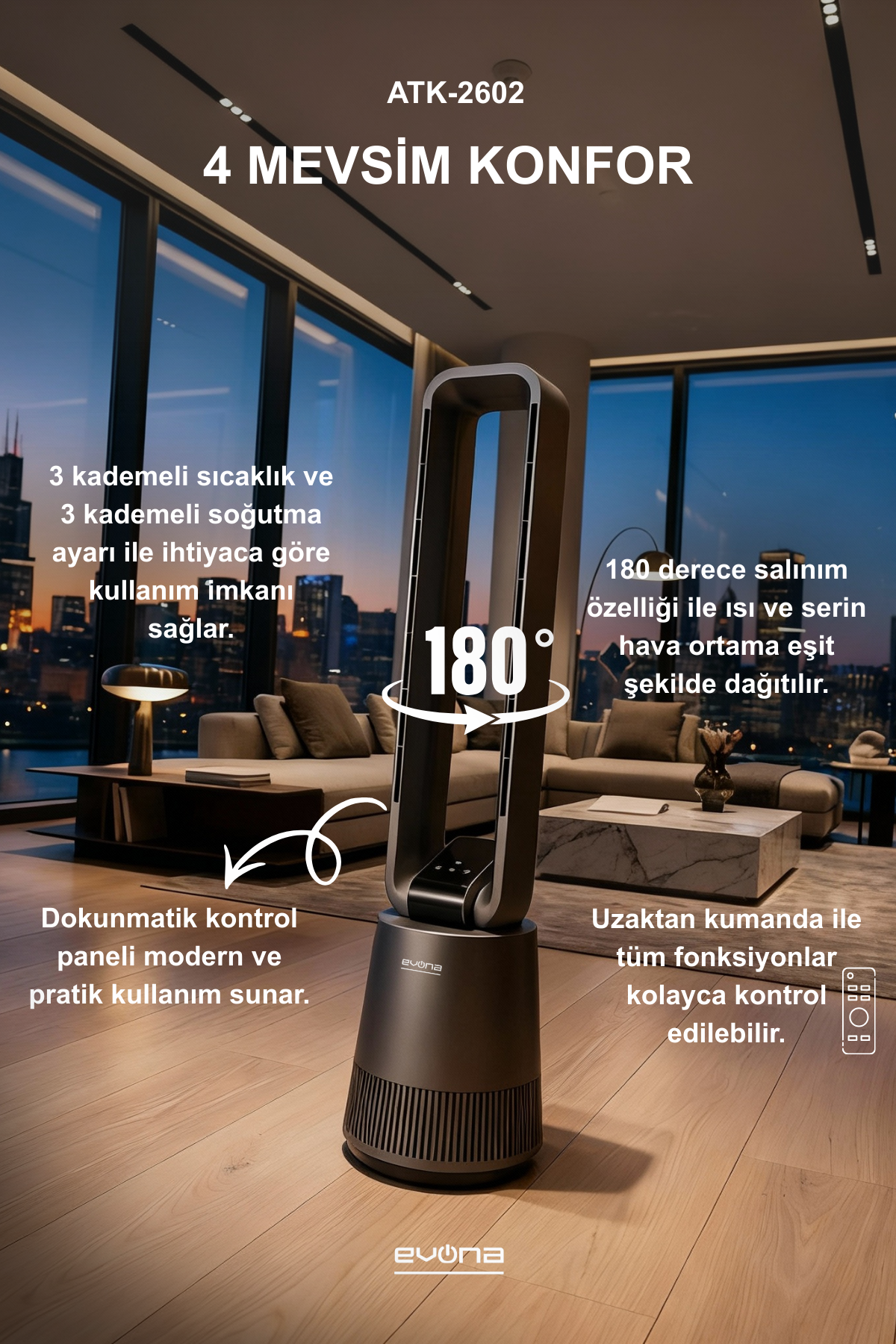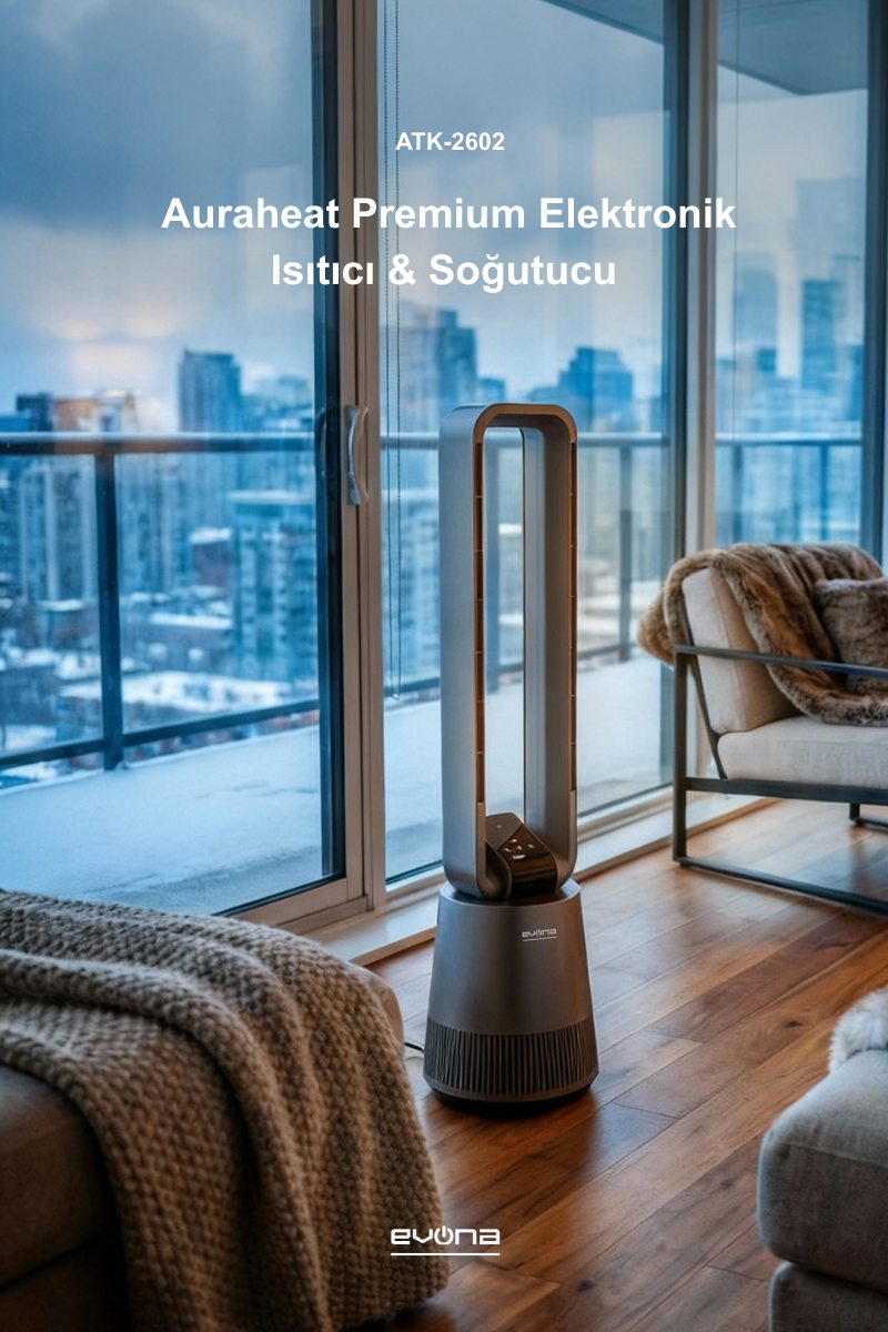 EVONA AuraHeat, bıçaksız hava akışı teknolojisiyle maksimum güvenlik ve sessiz performansı bir arada sunar. Modern tasarımı, akıllı sıcaklık kontrolü ve uzaktan kumandasıyla yaşam alanlarınıza şıklık ve konfor katar.